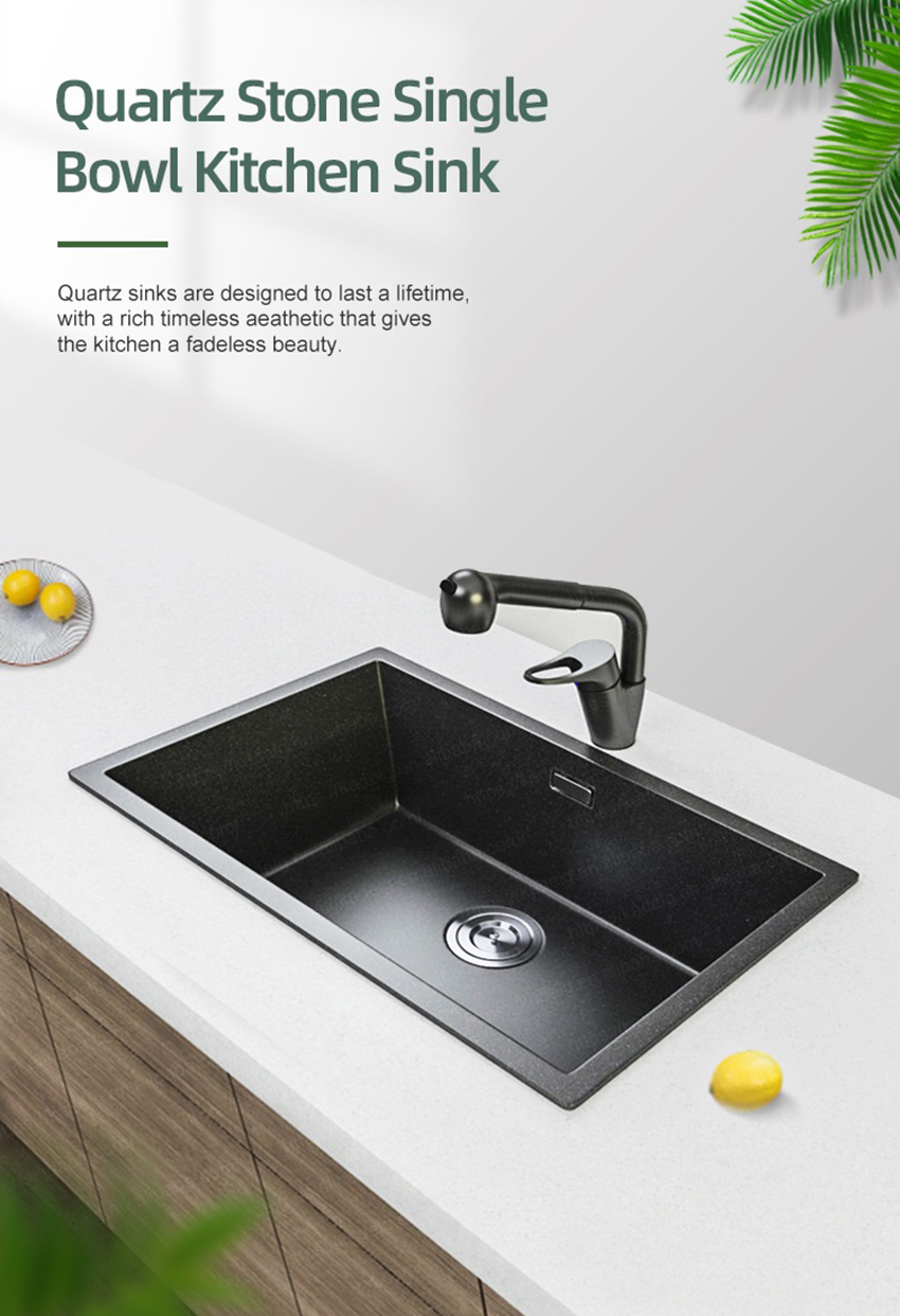 The composite quartz granite kitchen sink, is designed to last a lifetime, with a rich timeless aesthetic that gives the kitchen a fadeless beauty. Our composite quartz granite kitchen sink is made from one mixed material of 80% granite quartz and 20% acrylic resin.